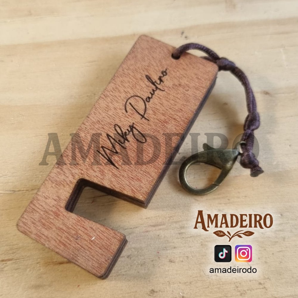Portacelular elaborado en madera natural compuesta, diseñado para brindar soporte estable a tu teléfono móvil en posición vertical u horizontal. Su diseño incluye un llavero integrado, lo que permite llevarlo contigo fácilmente y usarlo en cualquier momento y lugar.